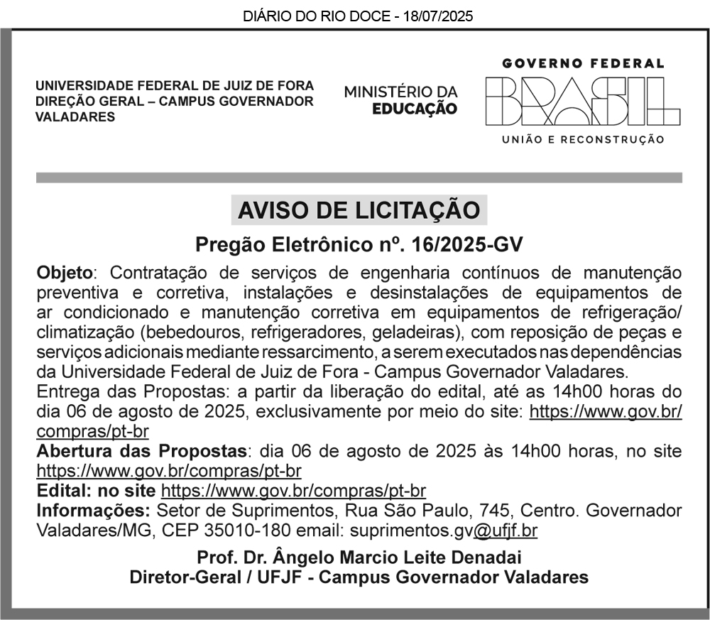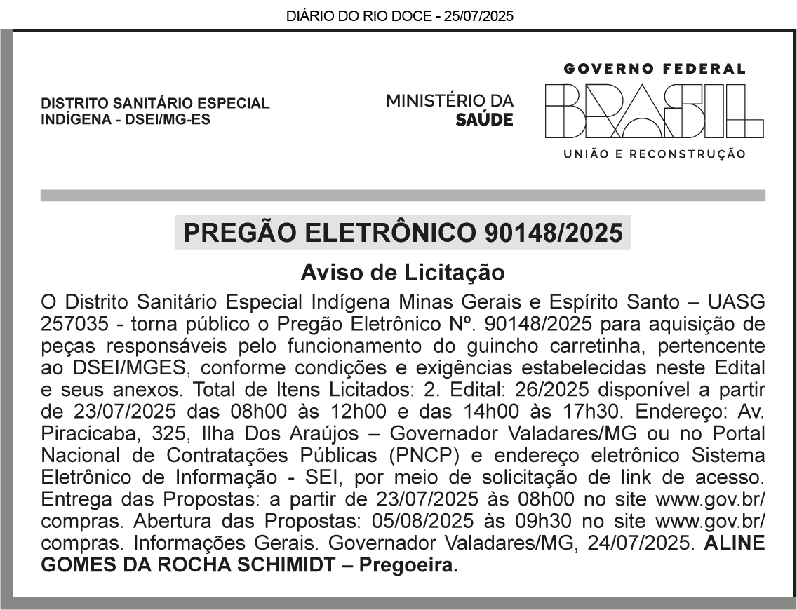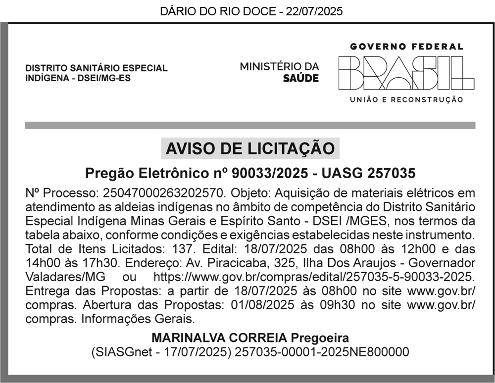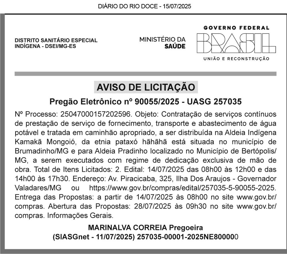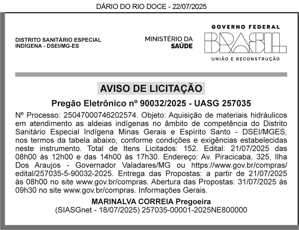 PREFEITURA MUNICIPAL DE DIVINO DAS LARANJEIRAS – MG, AVISO DE LICITAÇÃO, PROCESSO LICITATÓRIO Nº 17/2025, PREGÃO PRESENCIAL Nº 16/2025. O Município de Divino das Laranjeiras/MG comunica que abrirá Processo Licitatório nº 17/2025, Pregão Presencial nº 16/2025. Objeto: Registro de preço para eventual contratação de empresa para prestação de serviços de locação de escavadeira hidráulica sobre esteiras para manutenção das atividades da Secretaria Municipal de Obras, Serviços Urbanos e Transporte, conforme especificações no termo de referência anexo ao Edital. Data da abertura: 07/08/2025 às 09h00. Aquisição do edital na sede da Prefeitura Municipal de Divino das Laranjeiras-MG, e-mail: licitacao@divinodaslaranjeiras.mg.gov.br ou site: http://divinodaslaranjeiras.mg.gov.br/licitacoes/. Tel.: (33) 99912-1893. Katrine Martins Macedo, Agente de Contratação.