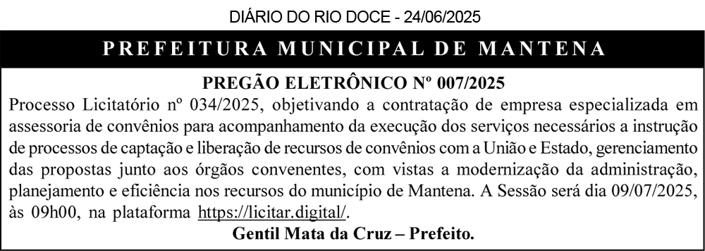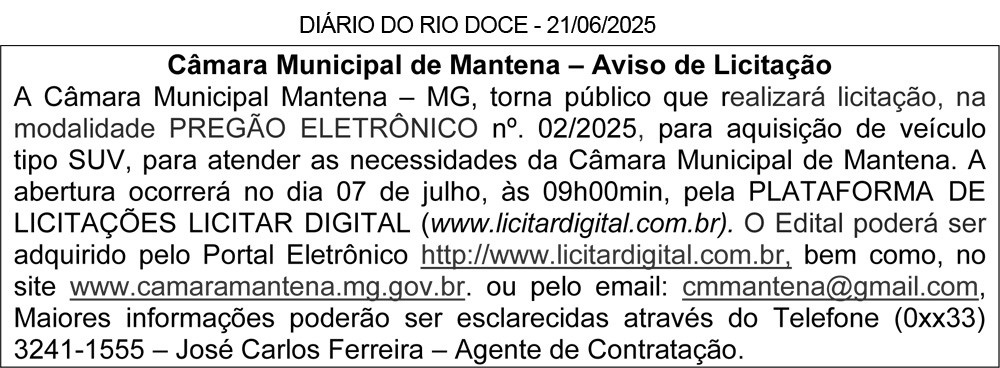 PREFEITURA MUNICIPAL DE SÃO JOÃO DO MANTENINHA – MG – PROCESSO LICITATÓRIO N°: 016/2025 –AVISO DE LICITAÇÃO – O Município de São João do Manteninha/MG, torna público, que abrirá o Processo Licitatório N°: 016/2025, na modalidade Pregão Eletrônico N°: 010/2025, tipo menor preço por item, cujo objeto é a aquisição de materiais de expediente. A abertura será dia 03/07/2025 às 09h20, na plataforma www.licitardigital.com.br . Os interessados poderão retirar o edital e obter informações pelo Email: pmsjmlicita@gmail.com , pelo site https://www.saojoaodomanteninha.mg.gov.br/, na plataforma www.licitardigital.com.br ou na sala de reuniões da Prefeitura, na Avenida Reginaldo Alves dos Santos, 59 – Centro – São João do Manteninha /MG nos dias úteis no horário 07:00 às 13:00. Walter Filho Ramos – Agente de Contratação.