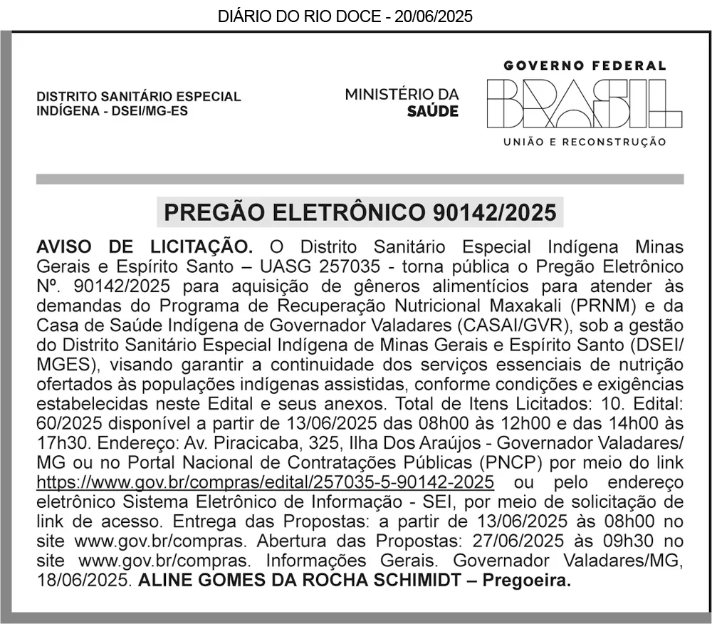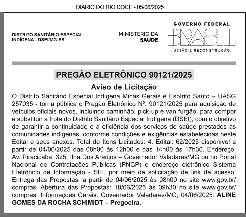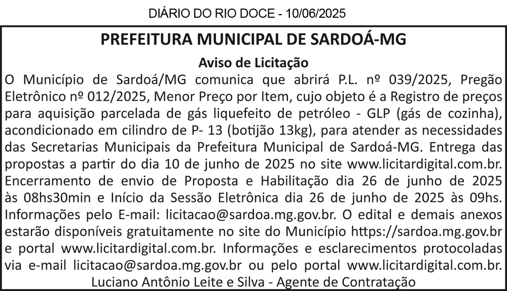 PREFEITURA MUNICIPAL DE COROACI/MG – AVISO DE LICITAÇÃO – PREGÃO ELETRÔNICO SRP Nº 018/2025 – O Município de Coroaci/MG comunica que realizará o Pregão Eletrônico para Registro de Preços nº 018/2025, cujo objeto é a aquisição de material hidráulico. O julgamento das propostas de preços e a fase de habilitação ocorrerão no dia 26/06/2025, às 09h00min, na sala do setor de licitação da Prefeitura Municipal de Coroaci. Mais informações poderão ser obtidas na Rua Dona Cotinha Gonçalves, nº 11 – Centro – Coroaci/MG, CEP: 39.710-000, pelo telefone (33) 9.8451-8656 ou pelo e-mail: licitacao@coroaci.mg.gov.br. Mateus Felipe de Souza Carvalho Cardoso – Agente de Contratação.
