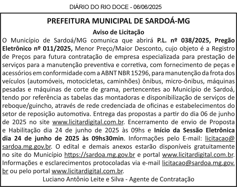PREFEITURA MUNICIPAL DE SÃO GERALDO DO BAIXIO – MG, Publicação de Reabertura de Extrato de Edital nº. 021. Fica designada a abertura do Processo de Licitação nº 027/2025 NA MODALIDADE “Pregão Presencial” nº 005/2025, para Registro de Preço visando a contratação de serviço de manutenção preventiva e corretiva e funilaria com FORNECIMENTO DE PEÇAS DE REPOSIÇÃO E ACESSÓRIOS ORIGINAIS/GENUÍNOS NÃO REMANUFATURADOS, não recondicionados, não recuperados, via tabela das montadoras para toda a Frota da Prefeitura Municipal. OS ENVELOPES PROPOSTA E HABILITAÇÃO DEVERÃO SER PROTOCOLADOS nesta prefeitura até o dia 13/06/25 os envelopes serão recebidos até as 09:00 hrs, a abertura dos envelopes Proposta e Habilitação ocorrerá no dia 13/06/25 as 09:00 hrs, na sala do Agente de Contratação, O EDITAL ENCONTRA-SE À DISPOSIÇÃO, NA INTEGRA, aos interessados, na sede da Prefeitura Municipal. A presente licitação será processada e julgada em conformidade com a Lei Federal nº 14.133/21.