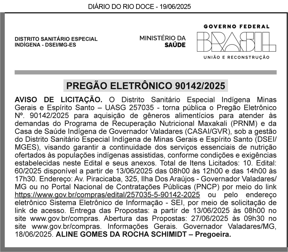 PROCESSO LICITATÓRIO Nº 086/2025 – PREGÃO ELETRÔNICO Nº 009/2025. Objeto: Registro de Preços para futura Aquisição de Gêneros Alimentícios para atender as Secretarias do Município de Galiléia/MG. Início de Recebimento das Propostas: 25/06/2025, às 08h00min. Fim do Recebimento das Propostas: 08/07/2025, às 08h00min. Data da Sessão Eletrônica: 08/07/2025, às 09h00min. Local: BLL www.bll.org.br. Aquisição do Edital na sede da Prefeitura Municipal de Galiléia, MG, E-mail: licitacao@galileia.mg.gov.br, Site: http://galileia.mg.gov.br/licitacoes/ e Portal Nacional de Compras Públicas (PNCP). Maiores Informações na sede da Prefeitura Municipal de Galiléia-MG, pelo email: licitacao@galileia.mg.gov.br ou pelo telefone: (33) 3244-1221. Galiléia-MG, 17/06/2025. Jonatas Melo Baltar. Secretário Municipal de Administração e Governo.