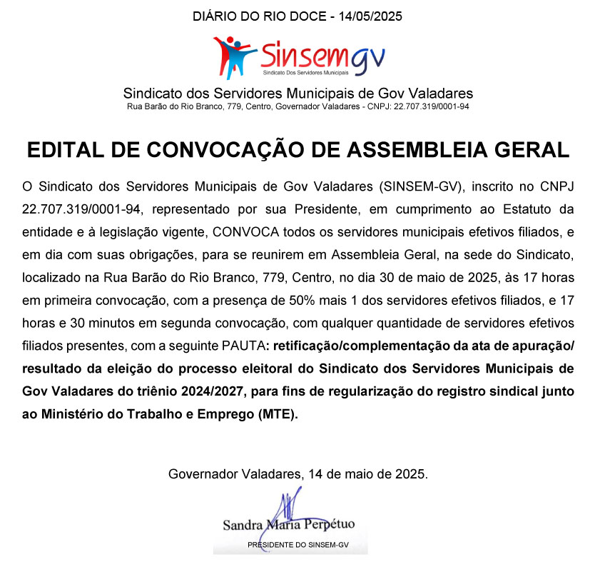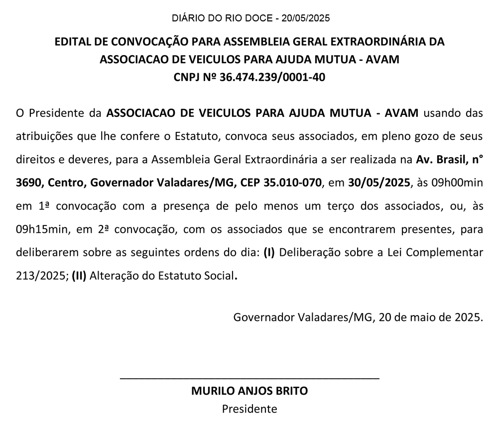 O Grupo de Apoio e Prevenção Oncológico de Governador Valadares – GAPON, inscrito no CNPJ\MF sob o n° 03.440.193/0001-90, CONVOCA, através do presente EDITAL, os seus membros, para a Assembleia Geral, destinada a ELEIÇÃO DE DIRETORIA E CONSELHO FISCAL, que será realizada às 19h30 no dia 29 de maio de 2025, na sede do GAPON – Rua Afonso Pena, no 2701, Sala 103, Centro, nesta cidade de Governador Valadares/MG. A Assembleia Geral se estende a todos os sócios quites com suas obrigações. Em caso de presença inferior de 2/3 (dois terços) dos membros, ocorrerá segunda convocação às 20h do mesmo dia, com qualquer número de sócios presentes. As chapas concorrentes à eleição, deverão ser inscritas, via requerimento escrito, destinado à Presidente do GAPON. A Assembleia tratará de: 1-Eleição da nova Diretoria e Conselho Fiscal; 2-Posse dos eleitos; 3- Definição de prazo do novo mandato. 4-Justificativa o atraso na realização da Assembleia (ausências por motivos de saúde de membros). Governador Valadares, 14 de maio de 2025. Oneide Alves Lima – Presidente GAPON