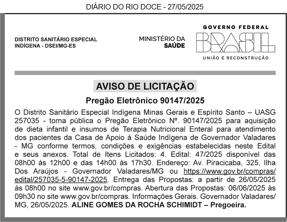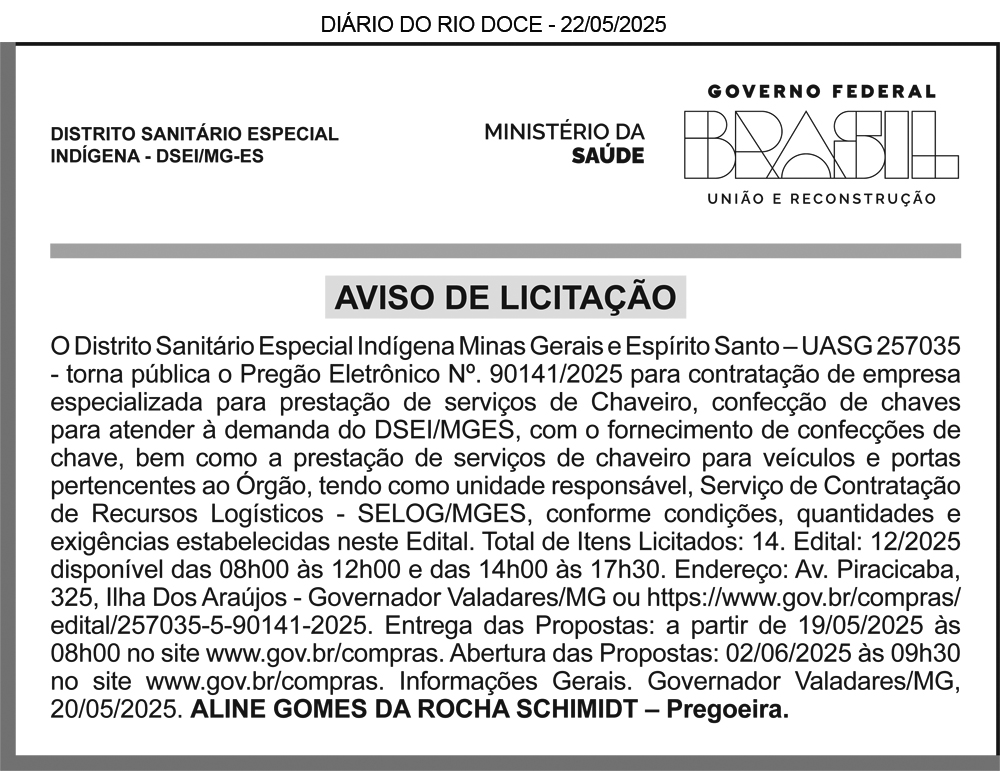 AVISO DE LICITAÇÃO – PROCESSO LICITATÓRIO Nº 12/2025 – PREGÃO Nº 11/2025, NA FORMA PRESENCIAL. O Município de Divino das Laranjeiras/MG comunica que abrirá Processo Licitatório nº 12/2025 – Pregão nº 11/2025, na forma presencial. Objeto: Registro de preços para eventual contratação de empresa especializada para disponibilização de Sistemas e Gestão Pública, englobando cessão do direito de uso, instalação, implantação, treinamento, customização, migração, adequação, suporte técnico, atualização tecnológica e assistência técnica ao Município de Divino das Laranjeiras/MG. Data da abertura: 09/06/2025 às 09h00. Aquisição do edital na sede da Prefeitura Municipal de Divino das Laranjeiras, MG, e-mail: licitacao@divinodaslaranjeiras.mg.gov.br ou site: http://divinodaslaranjeiras.mg.gov.br/licitacoes/. Tel.: (33) 99912-1893. Luana Silva Melo Palmares Lopes – Agente de Contratação.