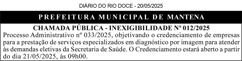 PREFEITURA MUNICIPAL DE CENTRAL DE MINAS/MG – Aviso de Credenciamento Nº 03/2025 – O Município de Central de Minas – MG, torna público aos interessados que será realizada licitação, na modalidade CREDENCIAMENTO Nº 03/2025, PROCESSO ADMINISTRATIVO DE LICITAÇÃO Nº 034/2025 – INEXIGIBILIDADE Nº 04/2025, tendo como objeto a contratação de serviços de clínica especializada em exames de ultrassonografia, visando atender às demandas da secretaria municipal de saúde do município de Central de Minas/MG. INÍCIO DE RECEBIMENTO DAS PROPOSTAS/HABILITAÇÃO: A partir do dia 21/05/2025 das 09h00min às 16h00min. Disponibilização do edital e informações no endereço eletrônico: https://www.centraldeminas.mg.gov.br/, E-mail: licitacentral2013@hotmail.com. Tel.: (33) 99987 – 0067.
