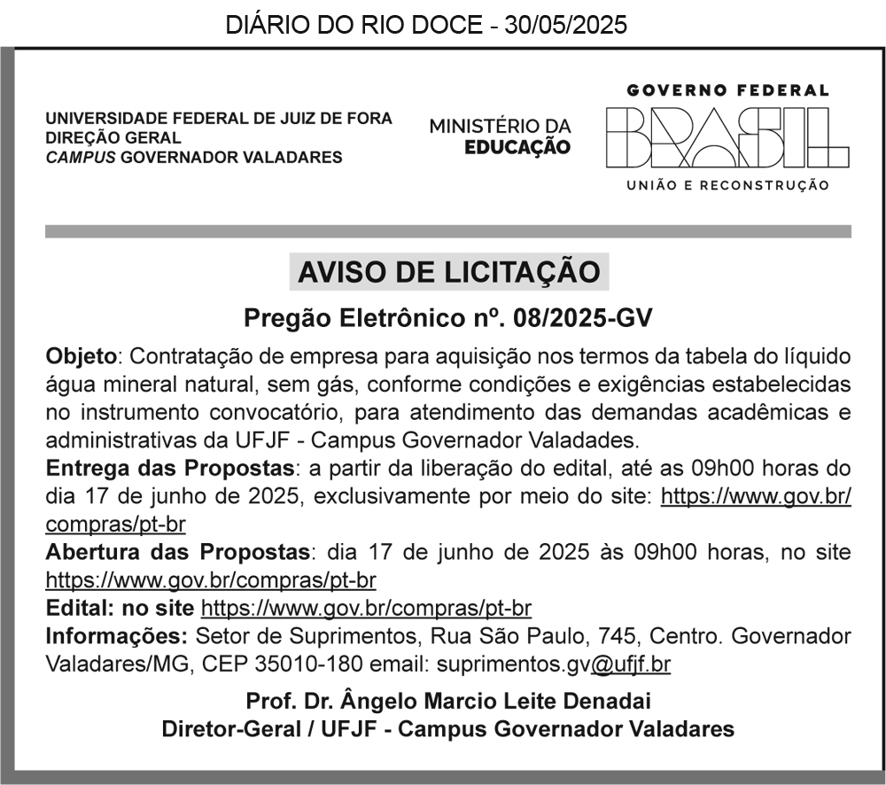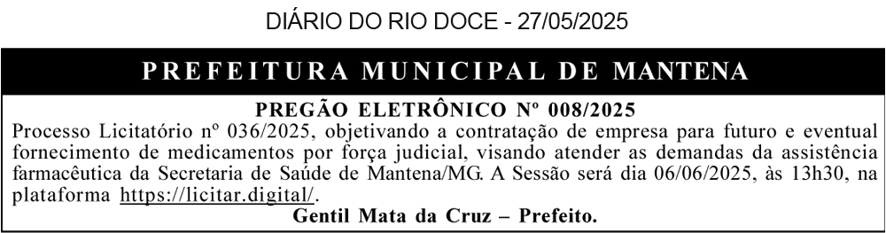 Do tipo menor preço, no dia 12/06/2025, as 08h:30min, na sede da Prefeitura Municipal, localizada à Rua João Massoriol, n.55, Bairro Vila Eugenio. Objeto; Registro de preço para futuro e eventual aquisição de água mineral 500 ml e 20lts e recarga de gás 13 kg para as diversas secretarias. Informações: (33) 3236-1867. Rafael Augusto França Oliveira Machado – Prefeito Municipal.