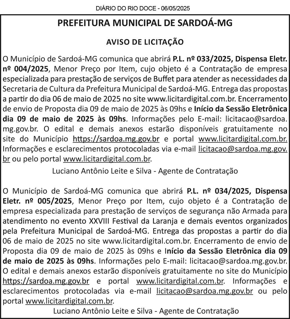 PREFEITURA MUNICIPAL DE SÃO JOSÉ DA SAFIRA/MG – AVISO DE LICITAÇÃO – CONCORRÊNCIA PRESENCIAL Nº 004/2025 – PROCESSO LICITATÓRIO Nº 022/2025 – O Município de São José da Safira/MG comunica que abrirá o Processo Licitatório nº 22/2025, modalidade Concorrência Presencial nº 04/2025, tipo menor preço global, cujo objeto é a contratação de empresa especializada em obras para construção de pontes no Município de São José da Safira/MG. A abertura será no dia 10/06/2025, às 13h00min, na Prefeitura Municipal de São José da Safira/MG, Rua Belo Horizonte, nº 45 – Centro. O edital poderá ser obtido na íntegra na Prefeitura Municipal ou solicitado através do e-mail: licitacaosafira@hotmail.com. Informações: Tel: (33) 3293-1133, com Sandra Pereira da Silva – Agente de Contratação.