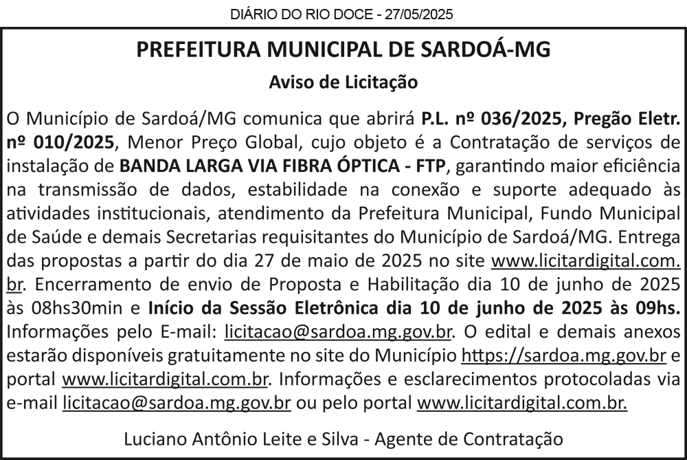 MUNICÍPIO DE PESCADOR-MG, TORNA PÚBLICO: Processo Licitatório nº 029/2025 – Pregão Presencial nº 009/2025, Objeto: Contratação de empresa para licenciamento de uso de sistemas de tecnologia integrados, para a gestão pública municipal, sendo em ambiente nuvem (data center externo), com os serviços de conversão de dados, implantação, migração de dados pré-existentes, treinamento, manutenção, suporte técnico e acompanhamento, e que atendam aos requisitos do Siafic, administração financeira e controle em um mesmo ambiente virtual. Julgamento: 10/06/2025 às 09h00min. Flávio Augusto Rodrigues Figueiredo / Pregoeiro de Contratação. Compras e Licitações: (33) 3284-2686 / licitacao@pescador.mg.gov.br