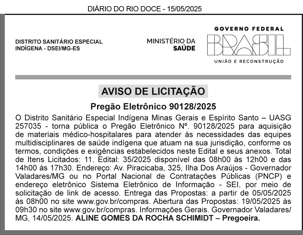 Aviso de Licitação, Processo Licitação nº 11/2025, Pregão Eletronico nº 10/2025. O Município de Divino das Laranjeiras/MG, comunica que abrirá Processo Licitatório nº 11/2025 – Pregão Eletrônico nº 10/2025. Objeto: Registro de Preço para futura contratação de empresa especializada para fornecimento parcelado de material de expediente visando à manutenção das atividades das diversas Secretarias do Município de Divino das Laranjeiras/MG. Data da abertura: 16/05/2025 às 09h00. Aquisição do edital na sede da Prefeitura Municipal de Divino das Laranjeiras/MG, e-mail: licitacao@divinodaslaranjeiras.mg.gov.br ou site: http://divinodaslaranjeiras.mg.gov.br/licitacoes/. Tel.: (33) 99912-1893. Luana Silva Melo Palmares Lopes, Agente de Contratação.