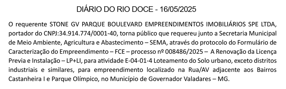 O requerente JORALE EMPREENDIMENTOS IMOBILIÁRIOS LTDA, portador do CNPJ:47.725.550/0001-31, torna público que recebeu da Secretaria Municipal de Meio Ambiente, Agricultura e Abastecimento – SEMA, através do processo Nº 021908/2024 a Licença Prévia e de Instalação Nº 014/2025, atividade E-04-01-4 Loteamento do Solo urbano, exceto distritos industriais e similares, para o empreendimento localizado na Rua/AV adjacente aos Bairros Castanheira I e Parque Olímpico, no Município de Governador Valadares – MG