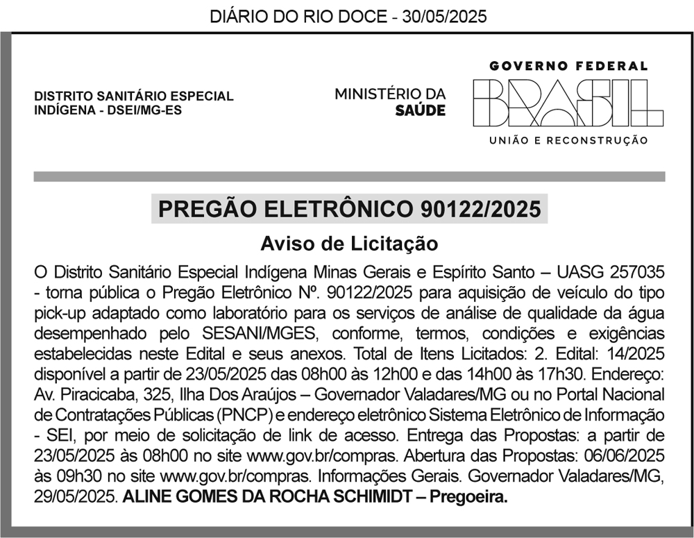 Prefeitura Municipal de São Geraldo do Baixio – MG, PUBLICAÇÃO DE ABERTURA DE EXTRATO DE EDITAL nº 005. Fica designada a abertura do Processo de Licitação nº 027/2025 NA MODALIDADE “Pregão Presencial” nº 05/2025, tipo “Menor Preço Por lote” para Registro de preço visando a contratação DE SERVIÇO DE MANUTENÇÃO PREVENTIVA E CORRETIVA E FUNILARIA COM FORNECIMENTO DE PEÇAS DE REPOSIÇÃO E ACESSÓRIOS ORIGINAIS/GENUÍNOS NÃO REMANUFATURADOS, não recondicionados, não recuperados, via tabela das montadoras para toda a Frota da Prefeitura Municipal. Os envelopes Proposta e Habilitação deverão ser protocolados nesta prefeitura até o dia 29/05/25 os envelopes serão recebidos até as 08:59 hrs, A ABERTURA DOS ENVELOPES PROPOSTA E HABILITAÇÃO ocorrerá no dia 29/05/25 as 09:00 hrs, na sala do Agente de Contratação, O EDITAL ENCONTRA-SE À DISPOSIÇÃO, na integra, aos interessados, na sede da Prefeitura Municipal. A presente licitação será processada e julgada em conformidade com a Lei Federal nº 14.133/21.