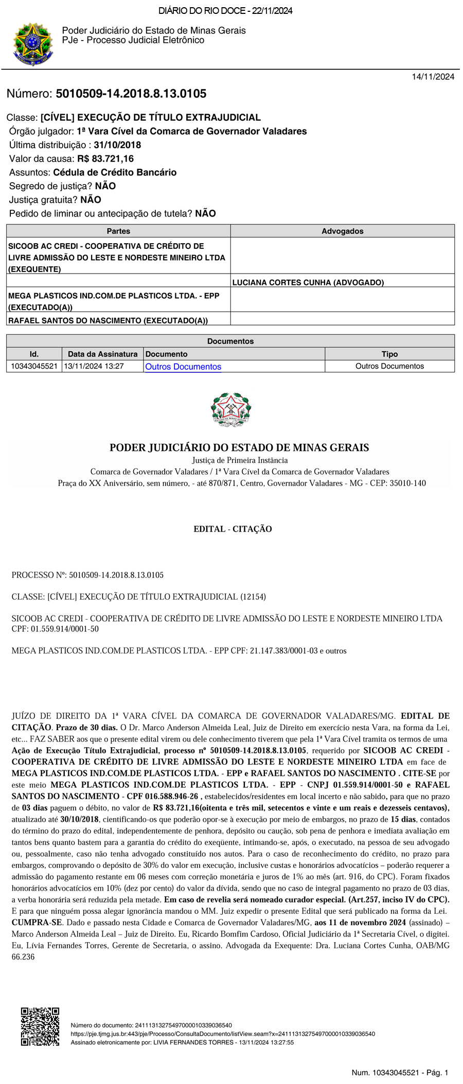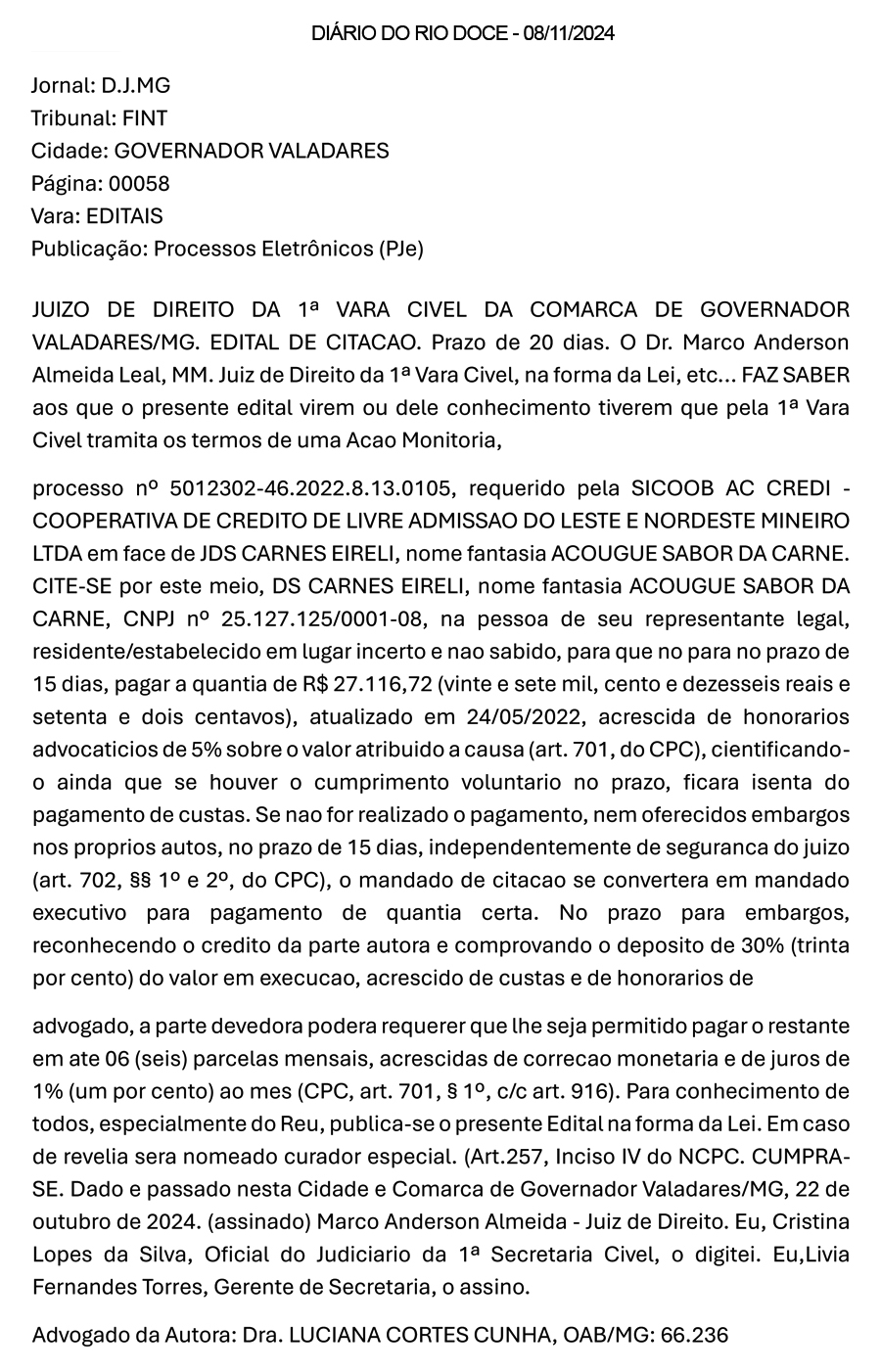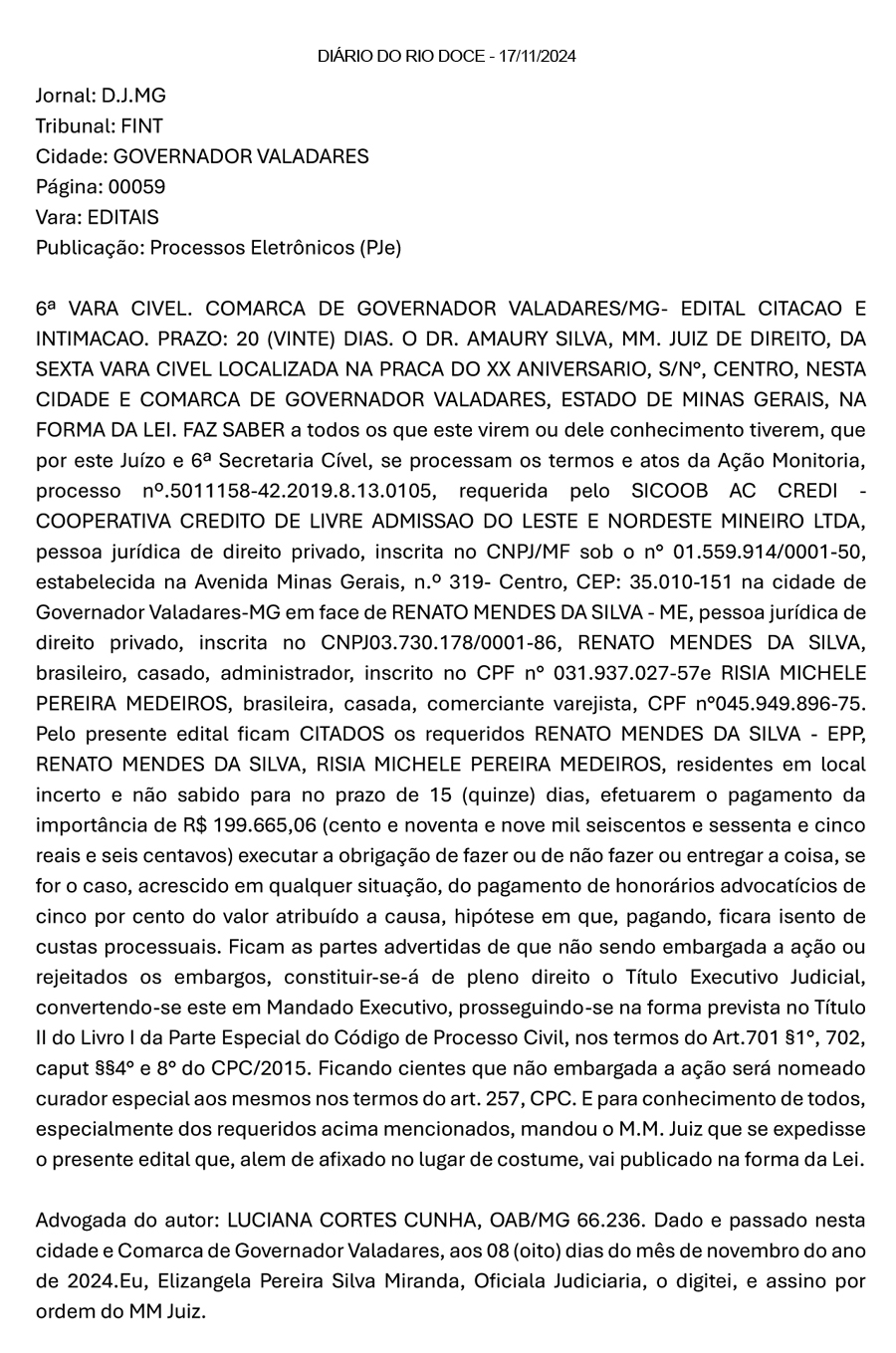 COMARCA DE GOVERNADOR VALADARES/ MG- EDITAL DE CITAÇÃO DE TERCEIROSINTERESSADOS – JUSTIÇA GRATUITA – PRAZO DE 20 DIAS- O Dr. LUPÉRCIO PAULOFERNANDES DE OLIVEIRA , Juiz de Direito da 7ª Vara Cível desta cidade e Comarca de GovernadorValadares, Estado de Minas Gerais, na forma da lei, etc. FAZ SABER aos que este virem ou deleconhecimento tiverem, que por este Juízo tramita uma ação de INTERDIÇÃO requerida por Vera LúciaSantana em face de João Luis Santana processo Nº 0318814-38.2014.8.13.0105 , que por sentença datadade 01/09/2020 declarou o requerido JOÃO LUIS SANTANA, brasileiro, pensionista, portador da CI3.012.043, filho de Nilsa Santana, residente e domiciliado na Rua Belém, 64, Bairro Santa Terezinha,nesta cidade, relativamente incapaz para exercer pessoalmente os autos da vida civil, nos termos do art.4º, III do CC, e, de acordo com o art. 1.775, ambos do mesmo diploma legal, nomeando CURADORA deJOÃO LUIS SANTANA a Sra VERA LÚCIA SANTANA, brasileira, auxiliar de serviço de educaçãobásica, portadora da CI M-5.854.633 e CPF 567.993.906-10, residente e domiciliada na Rua Belém, 64,Bairro Santa Terezinha – Governador Valadares-MG, que deverá representar o interditando em todos osatos da vida civil e que não poderá conservar em seu poder dinheiro, inclusive valores recebidos deentidade previdenciária, além do necessário para as despesas ordinárias com o sustento, saúde e bem-estardo interditado e a administração do seu patrimônio, efetuar saques em aplicações financeiras ou depósitosbancários, nem tampouco alienar ou onerar bens móveis, imóveis ou de qualquer natureza, sem préviaautorização judicial, a teor do disposto nos artigos 1.750, 1.753 e 1.754 do CCB. E para que chegue aoconhecimento de todos, expediu-se o presente edital que será publicado no DJE por 03(três) vezes, comintervalo de 10(dez) dias, na forma do artigo 1.184 do CPC. Dado e passado nesta cidade de GovernadorValadares, aos 26 de novembro de 2024. Eu, Cristiane Rodrigues de Faria, Oficial de Apoio Judicial,digitei. O Juiz de Direito da 7ª Vara Cível, Dr. Lupércio Paulo Fernandes de Oliveira.