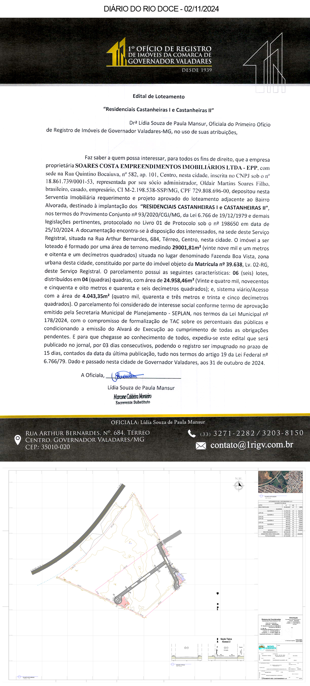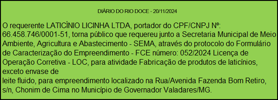 O requerente GV Empreendimentos Imobiliários SPE LTDA, portador do CNPJ 33.037.418/0001-22, torna-se público que requereu junto a Secretaria Municipal de Meio Ambiente, Agricultura e Abastecimento – SEMA, através do protocolo do Formulário de Caracterização do Empreendimento – FCE número 088/2024 Licença Prévia e de Instalação – LP+LI, para a atividade sob o código E-04-01-4, Loteamento do solo urbano, exceto distritos industriais e similares, para empreendimento Condomínio Portal Ibituruna Residencial, localizado na Estrada para Penha do Cassiano, proximidades do bairro Retiro dos Lagos, do Município de Governador Valadares/MG.
