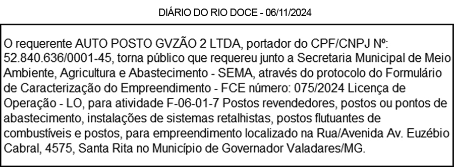 O requerente AUTO POSTO BELO VALE LTDA, portador do CPF/CNPJ Nº: 03.605.837/0001-52, torna público que requereu junto a Secretaria Municipal de Meio Ambiente, Agricultura e Abastecimento – SEMA, através do protocolo do Formulário de Caracterização do Empreendimento – FCE número: 079/2024 Licença de Operação – LO, para atividade F-06-01-7 Postos revendedores, postos ou pontos de abastecimento, instalações de sistemas retalhistas, postos flutuantes de combustíveis e postos, para empreendimento localizado na Rua/Avenida AVENIDA RIO BAHIA , 418, VILA BRETAS no Município de Governador Valadares/MG.