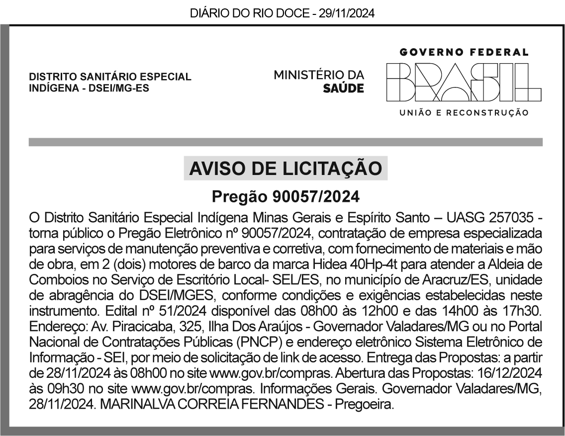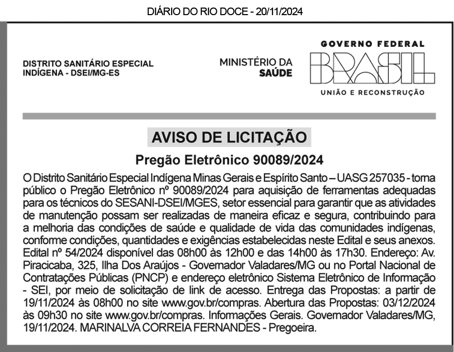 PREFEITURA MUNICIPAL DE CENTRAL DE MINAS/MG – AVISO DE REVOGAÇÃO PREGÃO ELETRÔNICO RP Nº 08/2024 – A Prefeitura Municipal de Central de Minas, por meio do seu Agente de Contratação, no uso de suas atribuições legais, e considerando a necessidade de ser oportunizado prazo para contraditório e ampla defesa, por força do disposto na letra “d” do inciso I do artigo 165 da Lei 14.133/21, torna público para o conhecimento dos interessados a Anulação do Processo Licitatório nº. 034/2024, Pregão Eletrônico RP nº 08/2024, que tem como objeto a aquisição parcelada de material esportivo para atender a demanda das secretarias da prefeitura Municipal de Central de Minas/MG. A anulação se dá em conformidade com inciso III do artigo 71 e Súmula nº 473 do Supremo Tribunal Federal em virtude de ocorrência de fato superveniente consistente na necessidade de serem efetuadas correções no cadastramento de itens no sistema de gestão de licitações e de sistema de condução de pregão eletrônico, para estar em conformidade com o Termo de Referência/Edital. Maiores informações podem ser obtidas junto ao Departamento de Licitação, no endereço: Av. Prefeito Genil Mata da Cruz Nº 12 – Centro, pelo Fone (33) 9 9987-0067 ou e-mail: licitacentral2013@hotmail.com em horário de expediente. Central de Minas/MG, 08 de novembro de 2024. Euclair Junior Soares Pereira. Agente de Contratação.