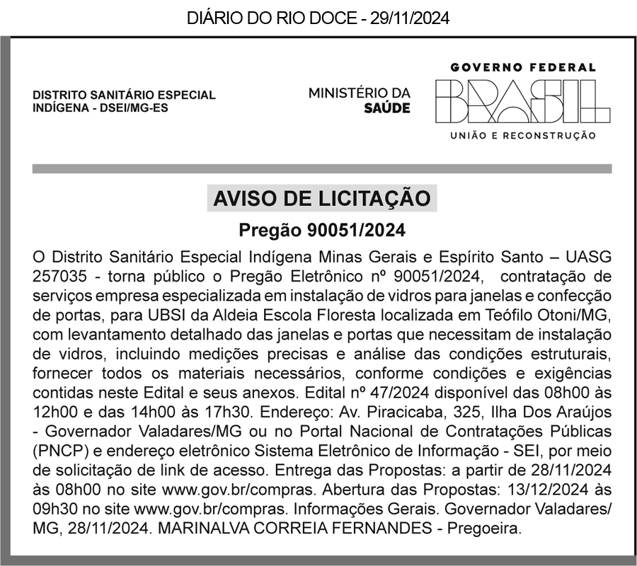 TEX A Prefeitura Municipal de Tumiritinga faz saber que realizará licitação, na modalidade Pregão Eletrônico n°. 43/2024, Processo Licitatório nº 131/2024. Objeto: Registro de preços para futura e eventual contratação de empresa especializada em serviços de vidraçaria, incluindo instalação e fornecimento de materiais, para atender as necessidades das diversas secretarias do município de Tumiritinga-MG. Abertura: Dia 13/12/2024, às 09h00min na Plataforma www.licitardigital.com.br. Maiores informações na plataforma.