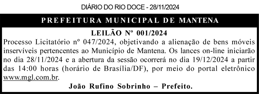 Do tipo maior lance, sendo conduzido pelo Leiloeiro Ronald de Freitas Moreira, JUCEMG 1093, do bem móvel, na forma Online, no dia 02/12/2024, às 13:30 horas, no site www.rofremleiloes.com.br. Local e dias para a visitação: 25/09/2024 ao dia 29/11/2024 no horário de 09:00 às 11:00 e de 13:00 às 17:00. No endereço Rua Curitiba, s/n, centro, Marilac – MG, nos dias úteis e de funcionamento da Prefeitura Municipal. Informações, fotos e edital no site ou pelo fone: (32) 9 9922-8029. Edmilson Valadão de Oliveira – Prefeito Municipal