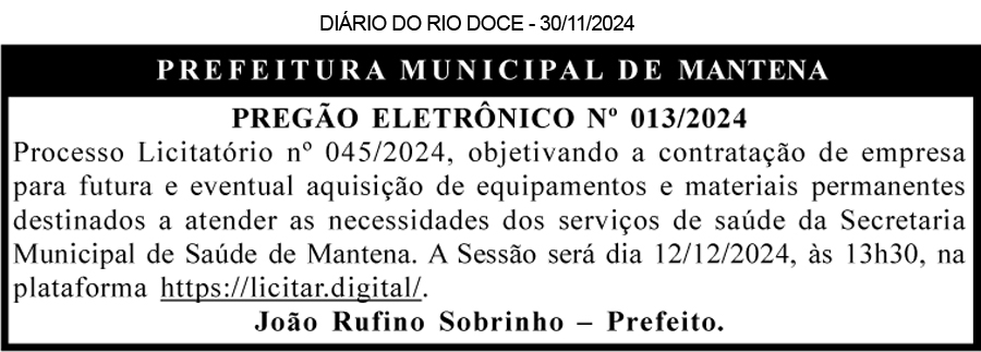 O Município de Periquito torna público que fará realizar, às 13h15min, do dia 21 de novembro de 2024, licitação pública na modalidade Pregão Eletrônico visando o registro de preços para futura e eventual aquisição de instrumentos musicais. Os interessados poderão retirar o Edital pelo site: www.periquito.mg.gov.br ou www.licitardigital.com.br. Informações complementares poderão ser obtidas através dos telefones (33) 3298-3010 / 3298-3013.