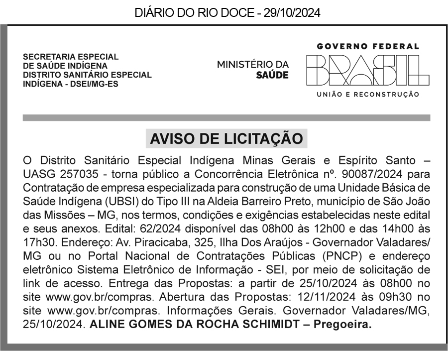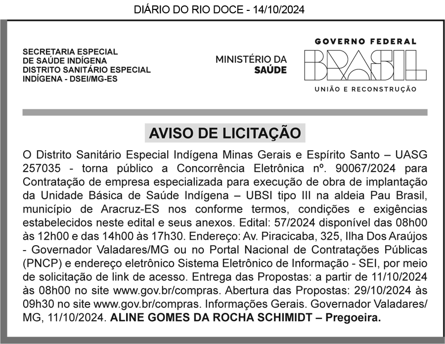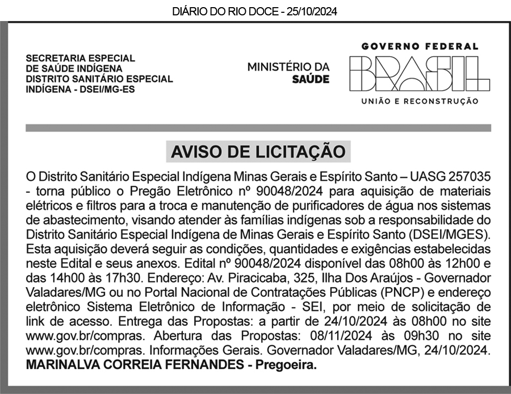 AVISO DE RETIFICAÇÃO PROCESSO LICITATÓRIO Nº 07/2024 – PREGÃO ELETRÔNICO Nº 05/2024 – Comunicamos que o AVISO DE LICITAÇÃO do Pregão 05/2024, publicado no Diário do Rio Doce, de 22 de outubro de 2024, que possui como objeto a contratação de pessoa jurídica para prestação de serviços de internet, manutenção, suporte técnico e fornecimento de equipamentos necessários à execução dos serviços, visando atender as demandas das Secretarias Municipais de Divino das Laranjeiras/MG, foi RETIFICADO para ajustes no COMPRAS.GOV.BR, necessitando alterar a data de abertura para o dia 12/11/2024, às 09h00, não havendo nenhuma alteração no instrumento editalício e seus anexos, sem prejuízo ao certame. Faz-se saber que no COMPRAS.GOV.BR o nº da LICITAÇÃO é 90005/2024. O edital com a data retificada encontra-se disponibilizado em sítio eletrônico do sistema de compras do Governo Federal, no sítio eletrônico do Município http://divinodaslaranjeiras.mg.gov.br/licitacoes/.