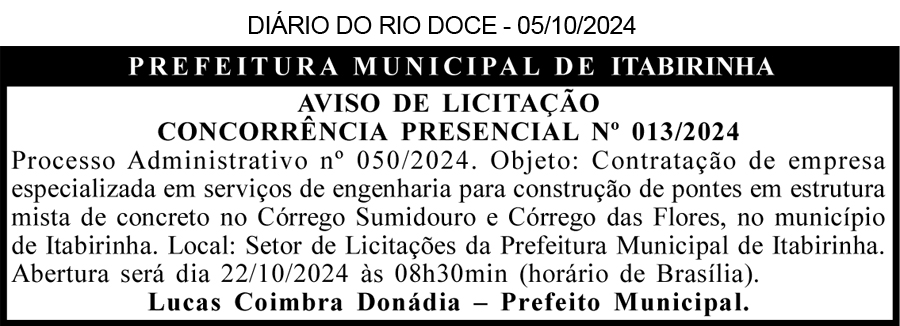 MUNICÍPIO DE PESCADOR-MG, TORNA PÚBLICO ERRATA DE AVISO DE LICITAÇÃO. Na edição publicada no dia 09 de outubro de 2024, do Diário do Rio Doce, na publicação do aviso de licitação – Processo Licitatório nº 032/2024 – Concorrência Presencial nº 006/2024, Objeto: Contratação de empresa para execução de Pavimentação de Estradas Vicinais no Município de Pescador/MG, conforme Contrato de Repasse OGU MIDR 959316/2024 – Operação 1093402-06, ONDE SE LÊ: Julgamento: 24/10/2024 às 09h00min, LEIA-SE: Julgamento: 31/10/2024 às 09h00min. Agente de Contratação. Compras e Licitações / licitacao@pescador.mg.gov.br