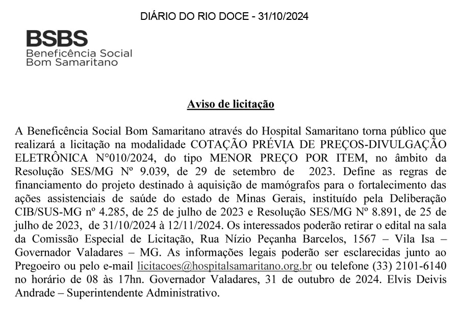 PROCESSO LICITATÓRIO Nº 111/2024 – PREGÃO ELETRÔNICO Nº 019/2024. Objeto: Registro de Preços para futura Prestação de Serviços Especializados em Manutenção Preventiva, Corretiva e de Calibragem de Equipamentos de Fisioterapia, Hospitalares e Odontológicos, em atendimento a solicitação da Secretaria de Saúde do Município de Galiléia/MG. Data da Sessão Eletrônica: 06/11/2024, às 09h00min. Local: BLL www.bll.org.br. Aquisição do Edital na sede da Prefeitura Municipal de Galiléia, MG, E-mail: licitacao@galileia.mg.gov.br, Site: http://galileia.mg.gov.br/licitacoes/ e Portal Nacional de Compras Públicas (PNCP). Maiores Informações na sede da Prefeitura Municipal de Galiléia-MG, pelo email: licitacao@galileia.mg.gov.br ou pelo telefone: (33) 3244-1309. Galiléia-MG, 15/10/2024.