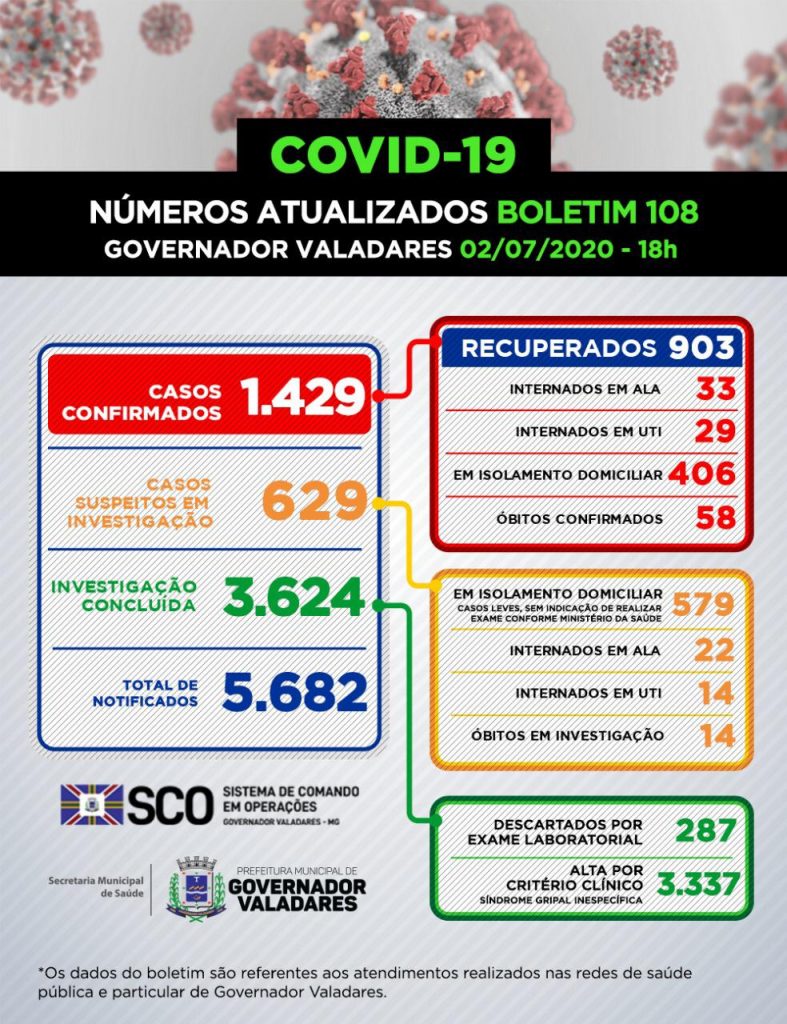 De acordo com o boletim, 629 casos ainda estão em investigação. A taxa de ocupação dos leitos de UTI no Hospital Municipal e no Hospital Bom Samaritano é de 62,5%; já os leitos da rede particular de saúde permanecem 100% ocupados. 25 pessoas estão internadas na UTI, enquanto 406 pacientes estão em isolamento domiciliar. Valadares ainda tem 14 óbitos em investigação.