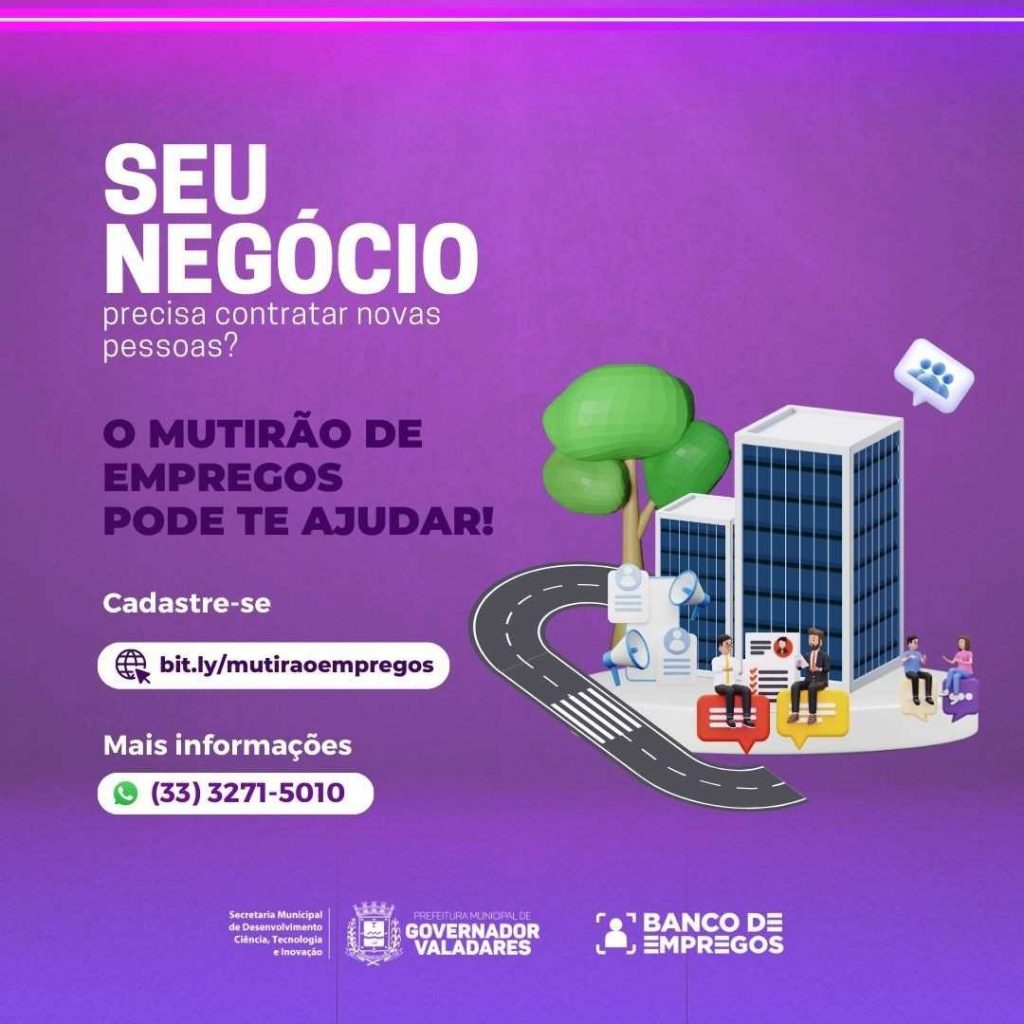 GOVERNADOR VALADARES – Empresas de Valadares têm até esta sexta-feira (13) para fazerem cadastro no Mutirão de Empregos que acontecerá na cidade. O mutirão, segundo a gestão municipal, ocorrerá no dia 21 de outubro (sábado), na Praça dos Pioneiros. Para oferecer vagas no evento, a organização, portanto, deve se inscrever pelo formulário on-line. Ou entrar em contato com a Prefeitura pelo número de whatsapp (33) 3271-5010.