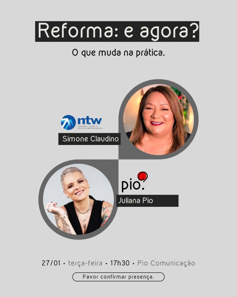 GOVERNADOR VALADARES – Na próxima terça-feira (27), às 17h30, a Pio Comunicação promove um encontro com o tema “Reforma: e agora? O que muda na prática”, voltado a microempreendedores individuais (MEIs), empresários optantes pelo Simples Nacional e pessoas que pretendem abrir uma empresa futuramente. O evento é gratuito, porém com vagas limitadas.