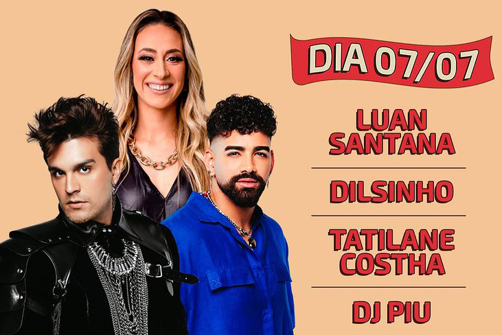 Na primeira noite do evento, os artistas Luan Santana e Dilsinho comandam os shows com sucessos sertanejos e pagodes. Tatilane Costha e DJ Piu também agitam a noite. Então para garantir sua entrada para o show, clique aqui.