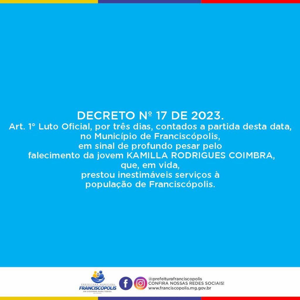 A Prefeitura Municipal de Franciscópolis decretou três dias de luto pela morte de Kamilla Rodrigues Coimbra após a confirmação da morte no domingo (23). O comunicado feito pelas redes sociais veio seguido de uma nota de pesar se solidarizando com familiares e amigos, “expressa as mais sinceras condolências pela perda”.