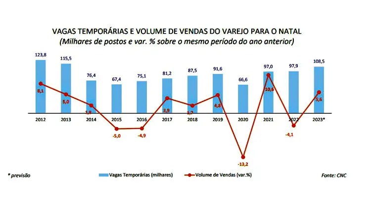 A expectativa da CNC é que a taxa de efetivação seja de 14,2%, acima de 2022, quando ficou em 12,3%, mas inferior a 2021 (14,9%), “quando o comércio ainda estava repondo as vagas que haviam sido fechadas nas duas primeiras ondas da pandemia”.