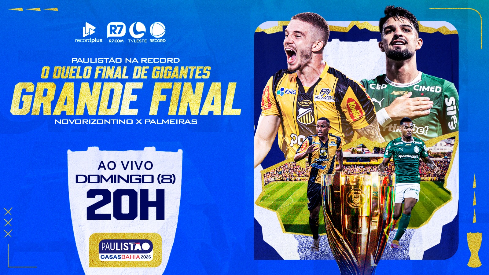 Fique ligado! Você acompanha a decisão do Campeonato Paulista 2026 entre Novorizontino e Palmeiras neste domingo (8), a partir das 20h, com transmissão da TV Leste|RECORDR7.com RecordPlus!