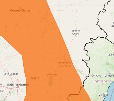 Os municípios de Governador Valadares, Ipatinga, Itabira e Montes Claros aparecem na área destacada pelo alerta laranja.