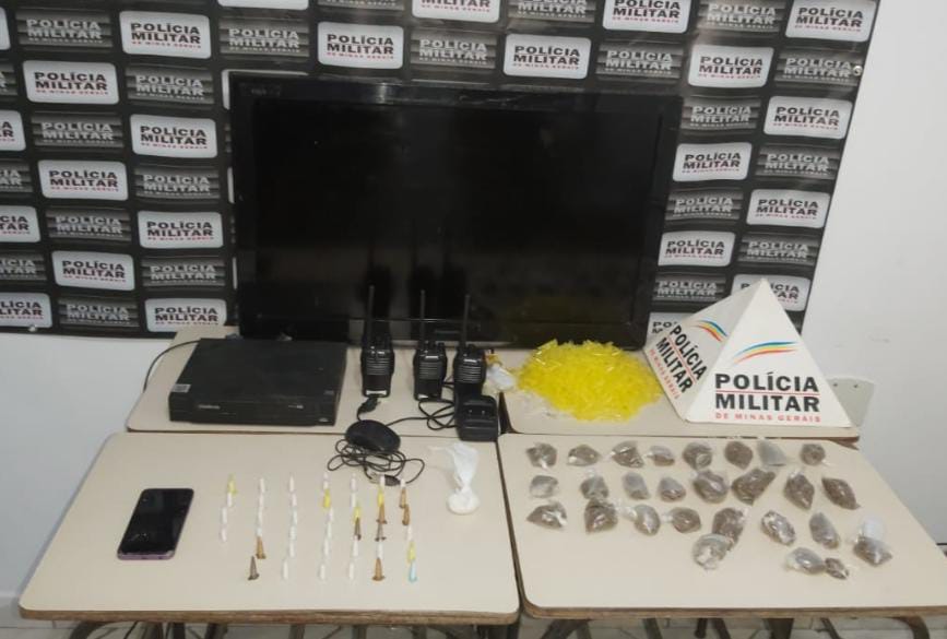 Durante minuciosa busca no interior do imóvel foram encontrados e apreendidos 97 pinos spendorff substância semelhante a cocaína, uma porção de substância semelhante a cocaína, 28 porções de tamanho considerável de substância semelhante a maconha, três rádios comunicadores, uma base carregadora de rádio, sacolas plásticas que seriam utilizadas para embalar drogas, vários pinos spendorff vazios, um celular de procedência duvidosa e um aparelho HD para armazenamento de imagens. Após a ação, o adolescente foi encaminhado para a Delegacia.