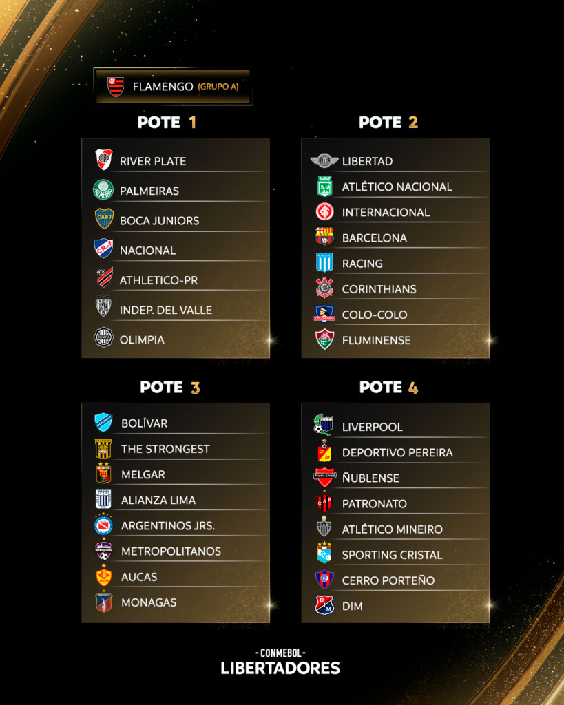 A Confederação Sul-Americana de Futebol (Conmebol) divulgou os potes do sorteio da fase de grupos da Libertadores, que será realizado em 27 de março, na sede da entidade, em Luque, no Paraguai.