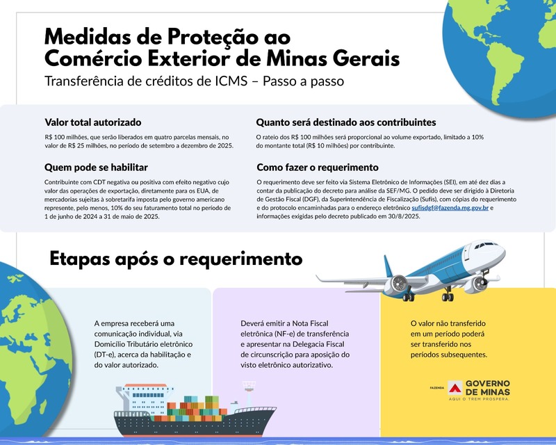 De acordo com a Secretaria de Fazenda (SEF/MG), o valor será repassado em quatro parcelas de R$ 25 milhões, entre setembro e dezembro, e contemplará contribuintes que exportam para os EUA mercadorias atingidas pela tarifa adicional. Entre os setores mais afetados estão alimentos (principalmente café), metalurgia, farmacêuticos, cosméticos, automotivo, máquinas e equipamentos e materiais de construção.