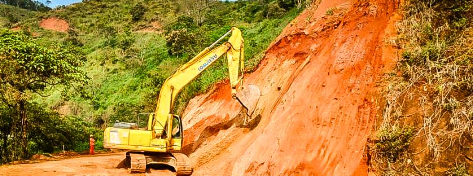 As intervenções começaram pelo trecho não pavimentado. As equipes do DER-MG executam os serviços de terraplenagem e estabilização de talude com a execução de muro de contenção em gabião, técnica utilizada para contenção, estabilização e taludes e controle de erosão.