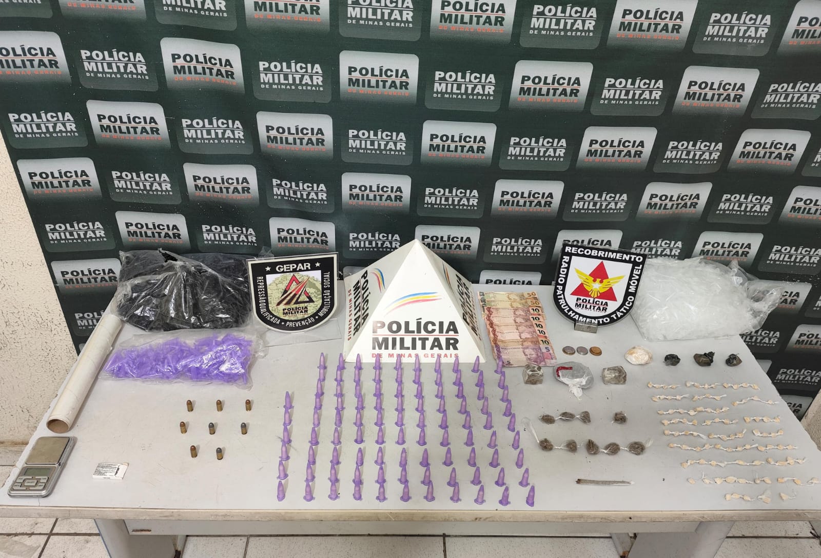 Em uma mochila descartada por um dos suspeitos, de acordo com os policiais, havia 94 pedras de crack e 96 pinos de cocaína. Já no interior do imóvel a PM apreendeu ainda oito cartuchos de calibre 380, quatro pedras de crack, um cigarro e nove buchas de maconha, uma balança de cozinha, materiais para embalar as drogas e R$ 158,10, em dinheiro.
