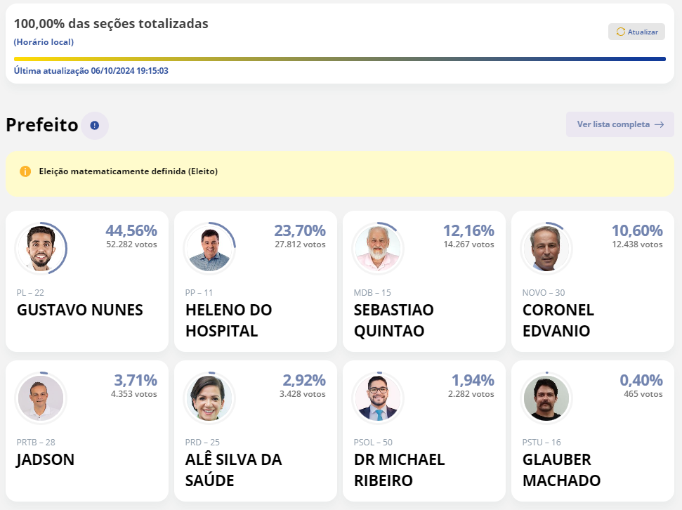 Gustavo Nunes somou 52.882 votos, o que representa 44,56% dos votos válidos. Em segundo lugar, ficou o candidato do Progressistas (PP) Heleno do Hospital com 23,70% dos votos válidos (27.812 votos).