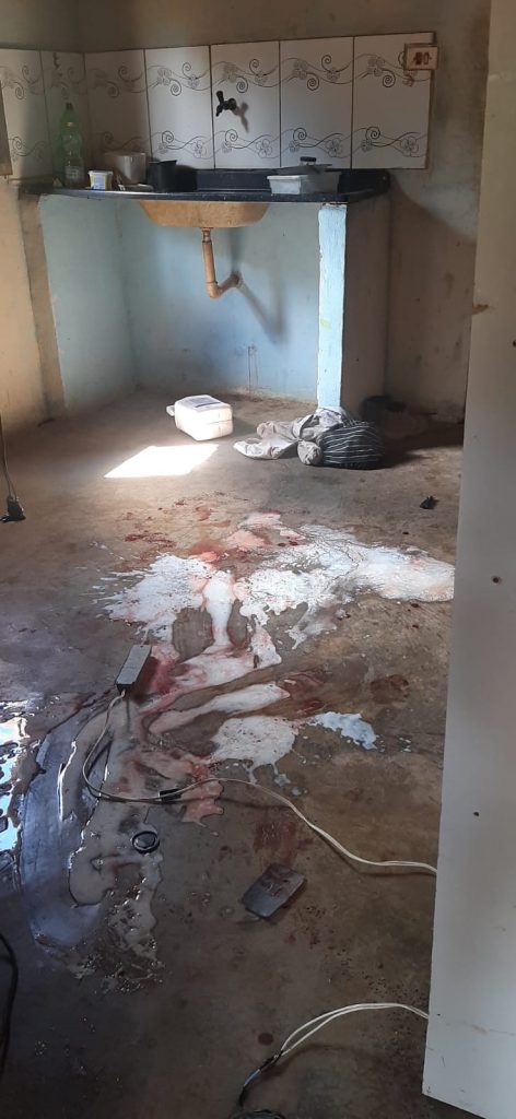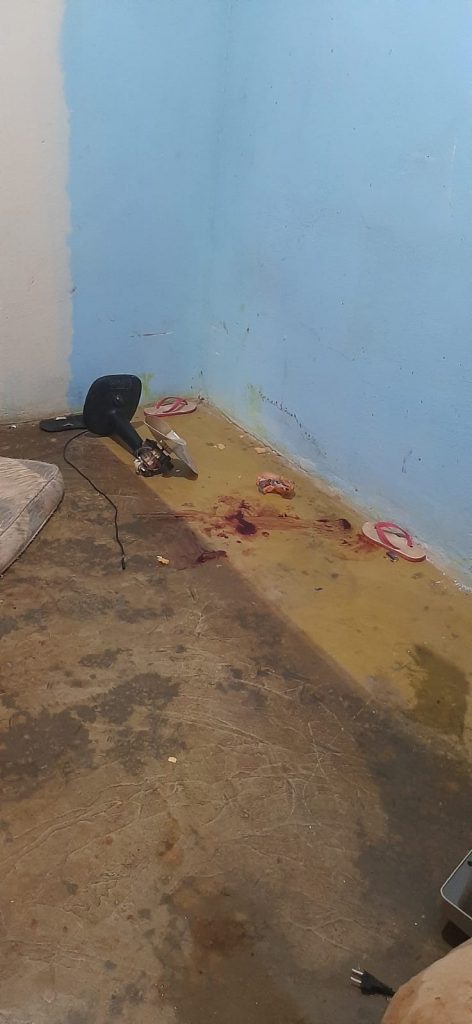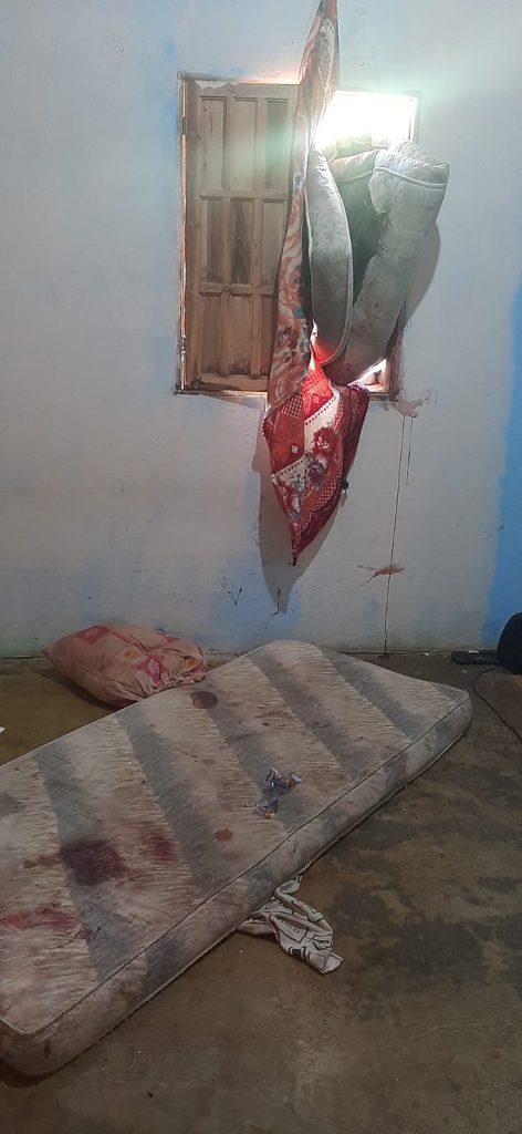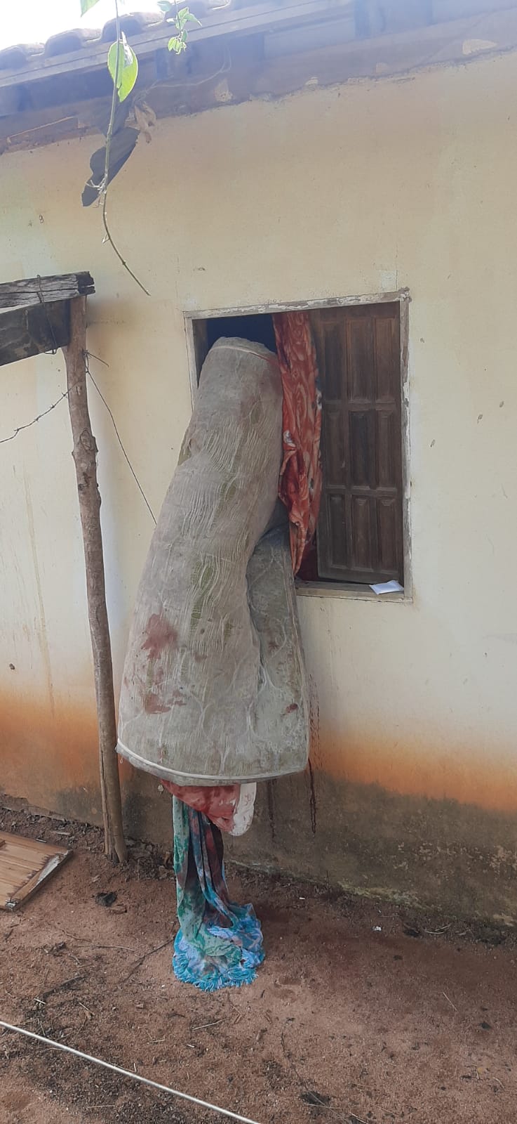 Quando chegaram no local do crime, os militares se depararam com um colchão sujo de sangue pendurado em uma das janelas da casa. Dessa forma, entraram na residência e viram o casal deitado em um colchão no chão e a mulher toda suja de sangue e apresentando lesões na mão e perna direita, além de hematomas pelo corpo.