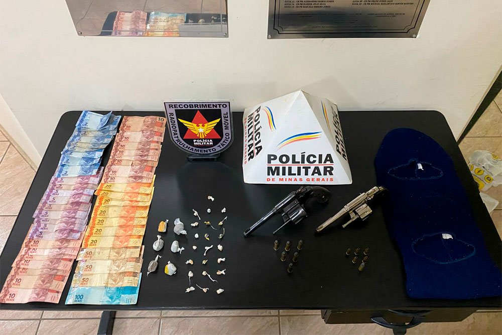 Durante a revista, os policiais encontraram embaixo das telhas da varanda um revólver calibre .32 com 6 munições; um revólver calibre .38 com 6 munições; duas toucas ninjas na cor azul marinho. Em um buraco na parede da casa, os militares encontraram um invólucro com 22 pedras de crack e 6 buchas de maconha; e dentro de um tênis, os policiais apreenderam R$ 587,00 em dinheiro.