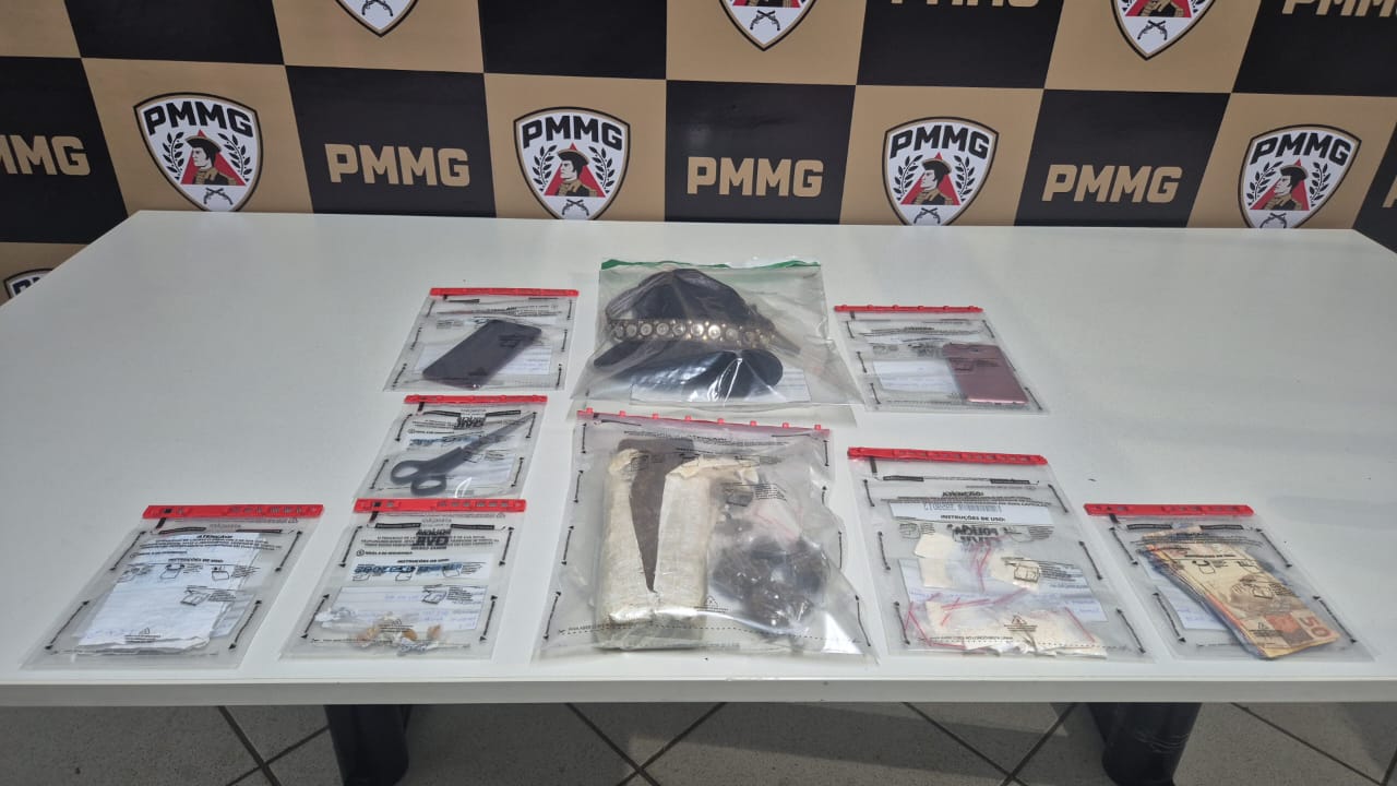 No local, foram apreendidos 18 invólucros com cocaína, uma tesoura com cabo preto, uma bucha de maconha, três tabletes e seis buchas de maconha, além de 10 pedras de crack, uma folha com anotações do tráfico, R$ 116 em dinheiro trocado, e dois celulares — um Motorola vermelho e um Samsung rosa, ambos com avarias.