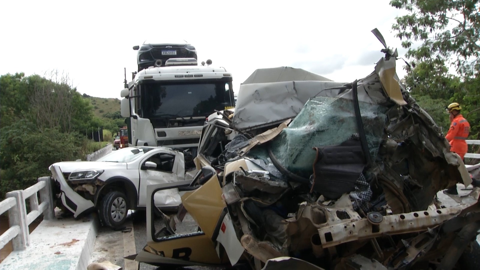 Ainda de acordo com a PRF, o acidente pode ter sido causado por um caminhão basculante. Ele entrou de forma lenta na pista. Por isso, uma das carretas precisou reduzir a velocidade. A van bateu na parte de trás. Em seguida causou um engavetamento.