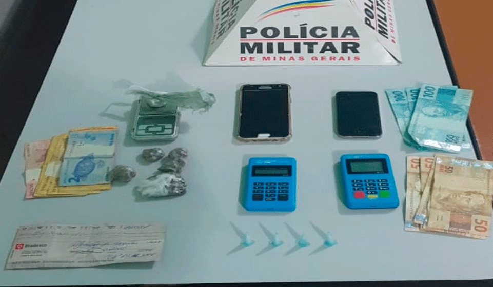 Depois disso, realizaram buscas no imóvel, onde foram encontrados uma balança de precisão, quatro buchas e um tablete de maconha, duas máquinas de cartão, um cheque no valor de R$ 100 e dois celulares.