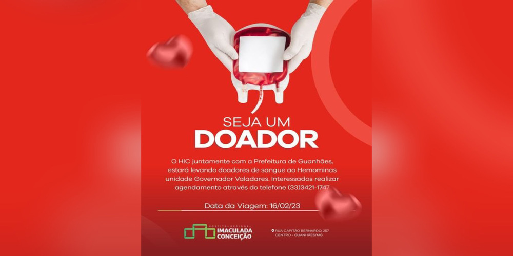 O Hospital Regional Imaculada Conceição (HIC), juntamente com a Prefeitura Municipal de Guanhães, está promovendo uma campanha de doação de sangue. O objetivo é levar doadores de sangue ao Hemominas de Governador Valadares.