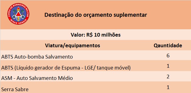 O orçamento de 10 milhões de reais que cabe ao Corpo de Bombeiros Militar já tem destinação certa. Por meio de estudo e planejamento, a corporação identificou como um dos maiores gargalos a reposição de viaturas para otimizar e aprimorar o atendimento operacional.