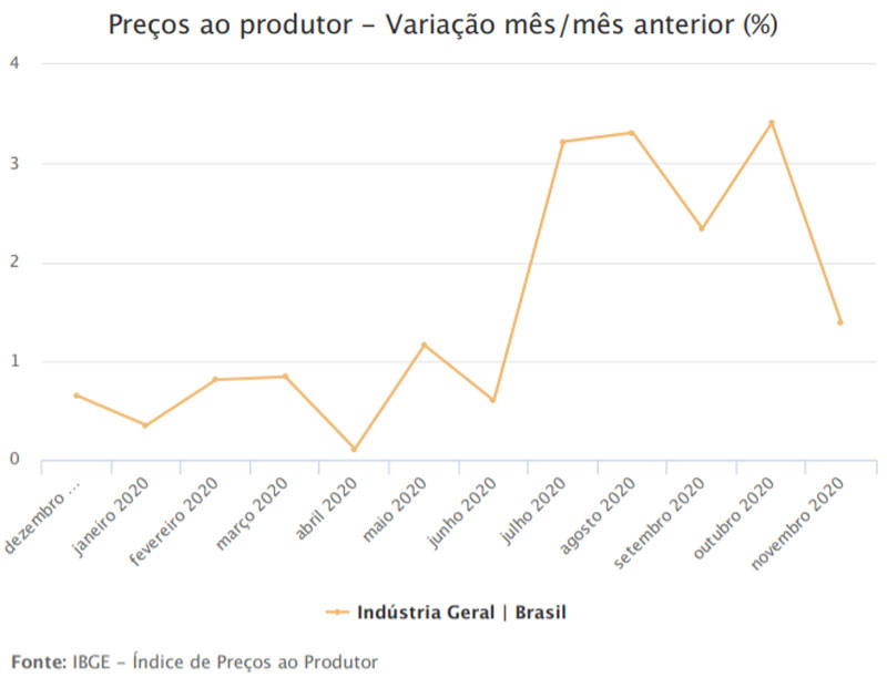 Os preços da indústria subiram 1,39% em novembro de 2020 frente ao mês anterior. Apesar da alta, houve uma desaceleração em relação ao resultado de outubro, quando o índice havia registrado a maior alta da série histórica (3,41%), iniciada em 2014. A inflação na indústria em novembro foi a menor observada em cinco meses, mas o indicador já registra dezesseis altas consecutivas e elevações históricas nos acumulados do ano (18,92%) e dos últimos 12 meses 19,69%.