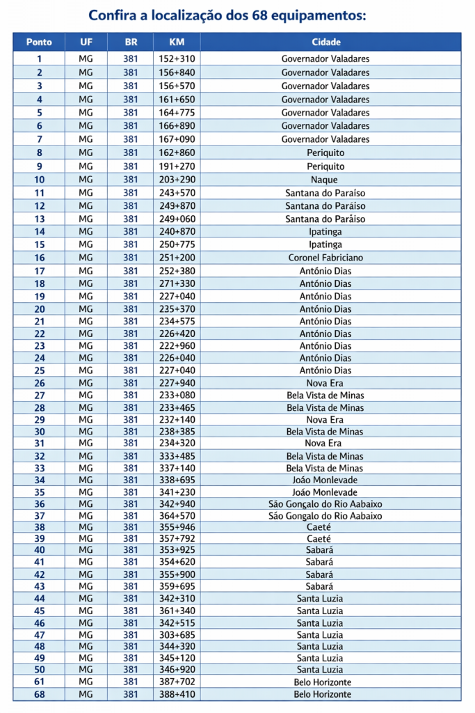 Os locais onde os radares estão sendo instalados foram definidos a partir de um estudo conjunto realizado pela Agência Nacional de Transportes Terrestres (ANTT), pela Polícia Rodoviária Federal (PRF) e pela Nova 381. O mapeamento considerou critérios técnicos, como segurança viária e histórico de acidentes.