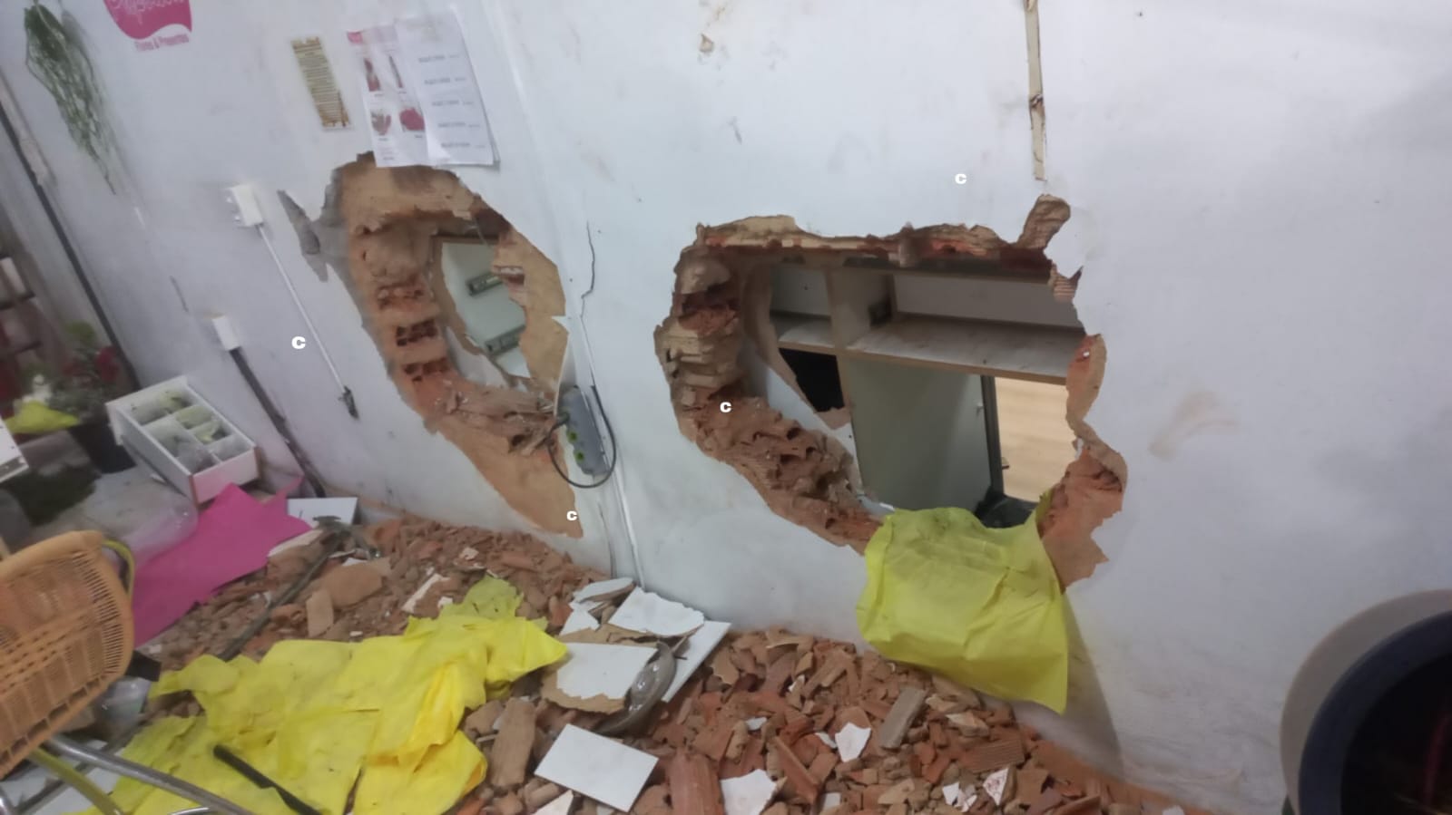 Já na joalheria, a proprietária confirmou o roubo de uma grande quantidade de joias de ouro e relógios. Os autores do crime utilizaram ferramentas como uma cavadeira de ferro, deixada no local, para abrir os buracos, e uma esmerilhadeira para cortar os cadeados. Apesar disso, não conseguiram arrombar o cofre.