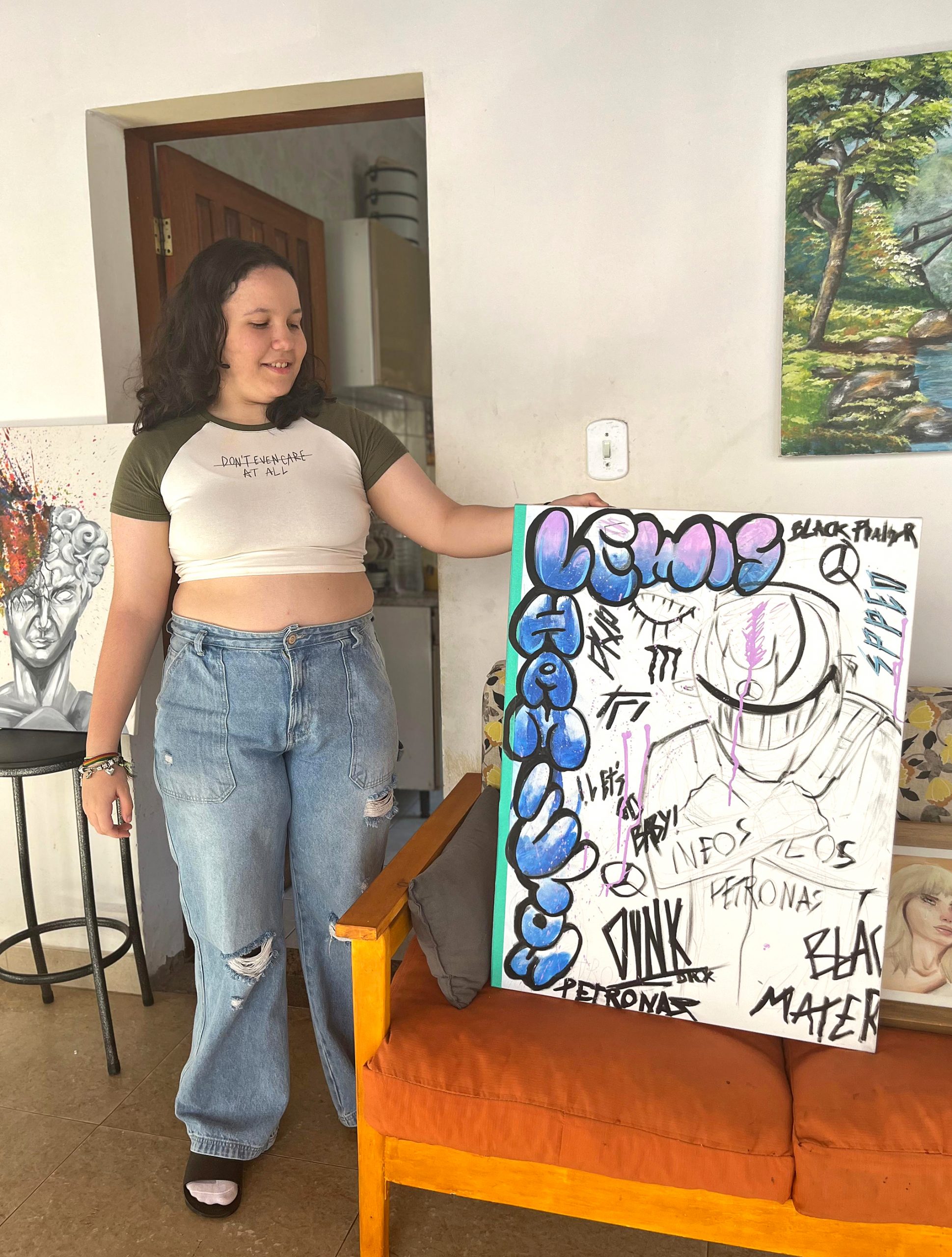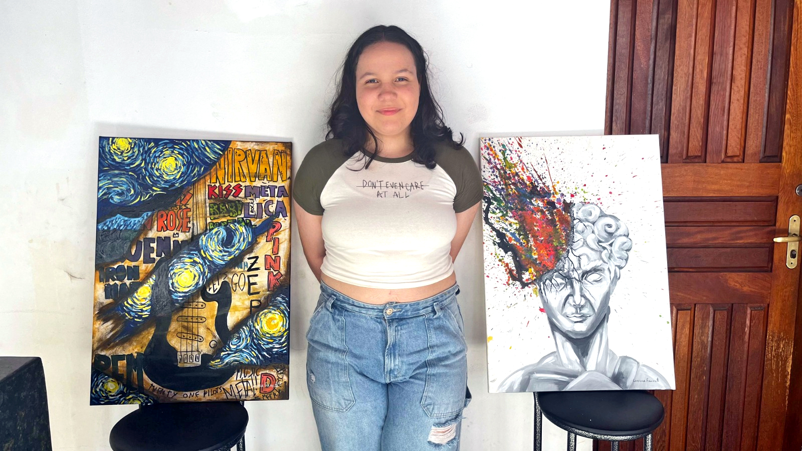 “Pra mim a pintura ajuda a relaxar, colocar uma ideia que fico semanas guardando e pensando se essa é a ideia certa. Aí depois coloco na tela para ver se vai dar certo mesmo, se vai ficar do jeito que eu pensei. Eu defino meu estilo como Pop Art. É tipo colocar a imaginação com uma ideia totalmente diferente, mesmo que seja estranho para quem é de fora, mas pra mim faz total sentido”, disse Larissa França.