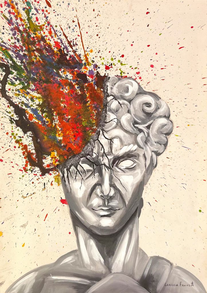 Para a galeria comercial em Paris, a Larissa vai enviar dois quadros que ela pintou nas últimas semanas. São duas telas inéditas pintadas para a exposição na França. A primeira pintura é um quadro que tem como tema o personagem da mitologia grega Apolo, conhecido como deus da beleza; é uma explosão de tinta que sai pela cabeça da escultura grega de cerâmica representando a beleza das cores e a vida do personagem.